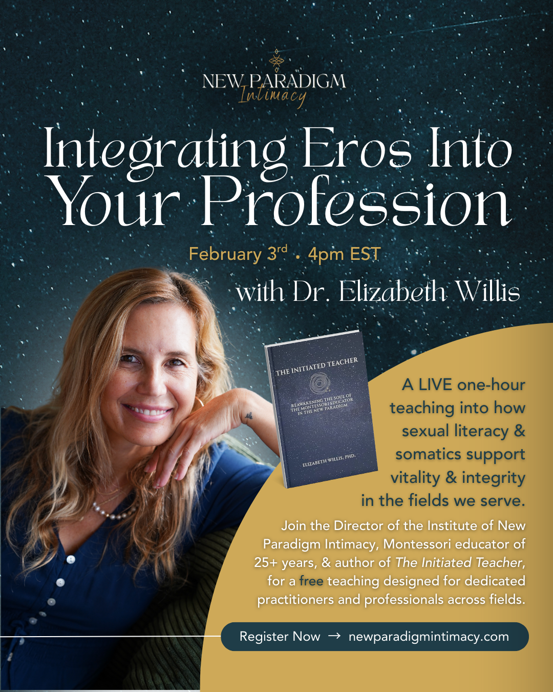 In this free one-hour teaching, Elizabeth Willis, PhD, introduces a framework for understanding sexual literacy as a missing dimension of professional development. Sexual literacy is not about sex acts or performance; it is the capacity to understand the body’s language, regulate the nervous system, recognize boundaries, and work skillfully with the energetic and relational dynamics that shape how we lead, teach, and serve.
